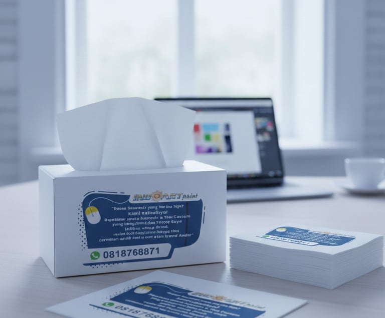 "Cari jasa cetak tisu custom? Di Indoart Print aja! Kami melayani pembuatan tisu dan kotak tisu full print untuk berbagai kebutuhan: ✅ Tisu Restoran & Kafe (Branding Logo) ✅ Tisu Souvenir Pernikahan/Engagement ✅ Tisu Merchandise Kantor ✅ Kotak Tisu Eksklusif (Hardbox/Softbox) Kualitas cetak tajam, bahan premium, harga kompetitif!"